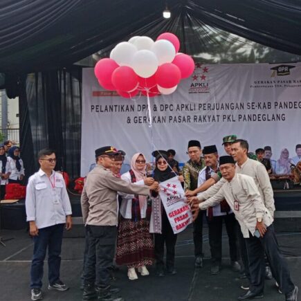 Pandeglang Banten,_ Ditengah pendulum paket kebijakan stimulus ekonomi 8+4+5, Balon Gerakan Pasar Rakyat (GPR) menjulang ke langit dilepas Bupati Pandeglang Raden Dewi Setiani. Hal tersebut dilakukan pada Gebyar Gerakan Pasar Rakyat PKL UMKM dan Pelantikan DPD/DPC APKLI-P Se-Pandeglang Banten di Alun-Alun Pandeglang, Jumat, 19/9/2025.