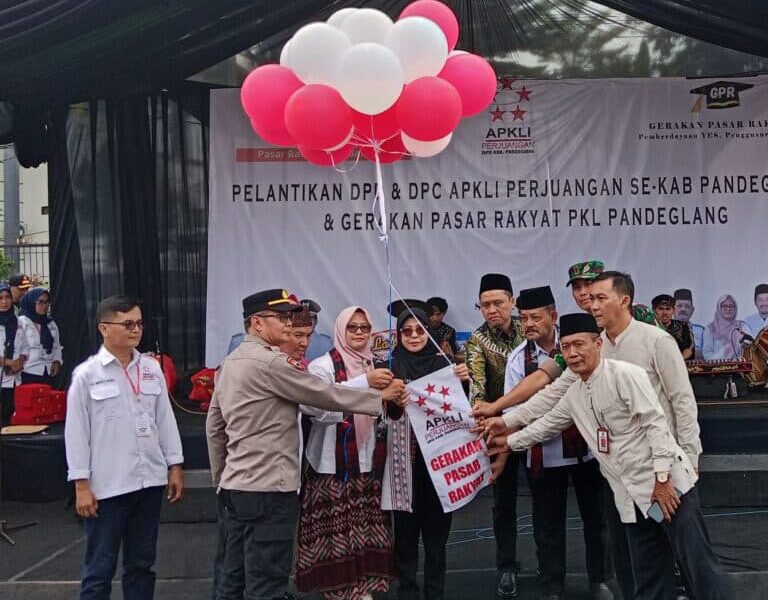 Pandeglang Banten,_ Ditengah pendulum paket kebijakan stimulus ekonomi 8+4+5, Balon Gerakan Pasar Rakyat (GPR) menjulang ke langit dilepas Bupati Pandeglang Raden Dewi Setiani. Hal tersebut dilakukan pada Gebyar Gerakan Pasar Rakyat PKL UMKM dan Pelantikan DPD/DPC APKLI-P Se-Pandeglang Banten di Alun-Alun Pandeglang, Jumat, 19/9/2025.