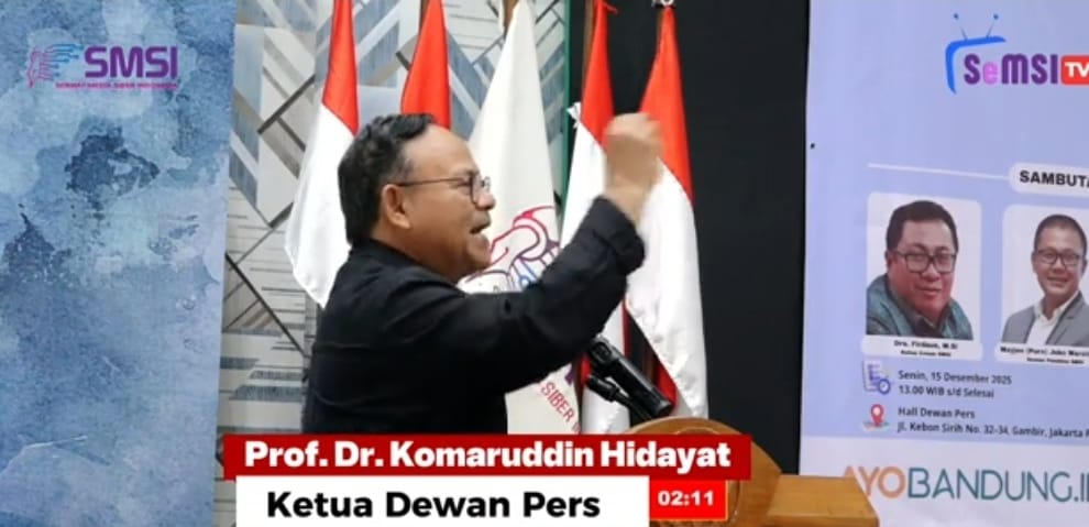 Pernyataan tersebut disampaikan Prof. Komaruddin saat menghadiri Dialog Nasional yang digelar Pengurus Pusat Serikat Media Siber Indonesia (SMSI) bertema “Media Baru Menuju Pers Sehat” di Hall Dewan Pers, Gambir, Jakarta Pusat, Senin (15/12/2025).